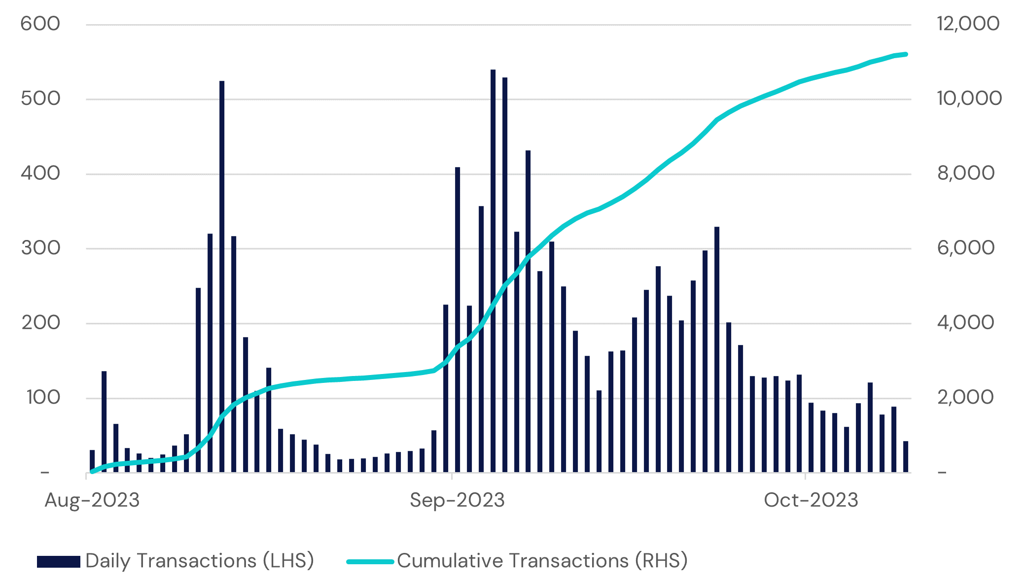 To see how these developments make for easier adoption, let’s consider Friend.tech (FT), a new social craze in the web3 space, which also taps into the speculative tendencies of crypto’s early adopters. In short, you can buy social tokens or “keys” of creators/influencers which provide access to a chatroom only available to holders. If you have a following of your own, then you can sell keys and earn fees on secondary trading. New users to the platform can authenticate via SMS, Google, or Apple, and behind the scenes Privy (FT’s onboarding partner) uses ERC-4337 to create a self-custodial embedded wallet for each user. There’s even credit card functionality to make it easier for the not-yet-crypto-converted. Activity levels have been choppy, but the adoption has been impressive. For a thoughtful discussion on SocialFi, check out this note from Decentralized.co.