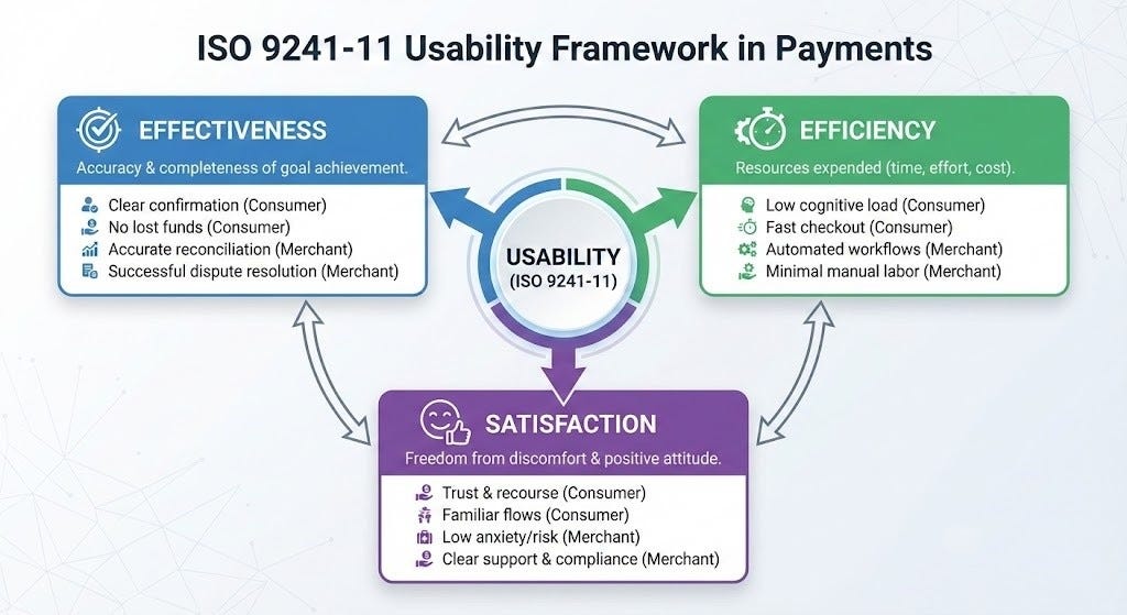 Consumers have a different set of priorities. They don’t care about operations or compliance. They judge a payment method by its usability. Subconsciously, they benchmark every transaction against the ISO 9241-11 usability framework, which defines usability through three distinct pillars: