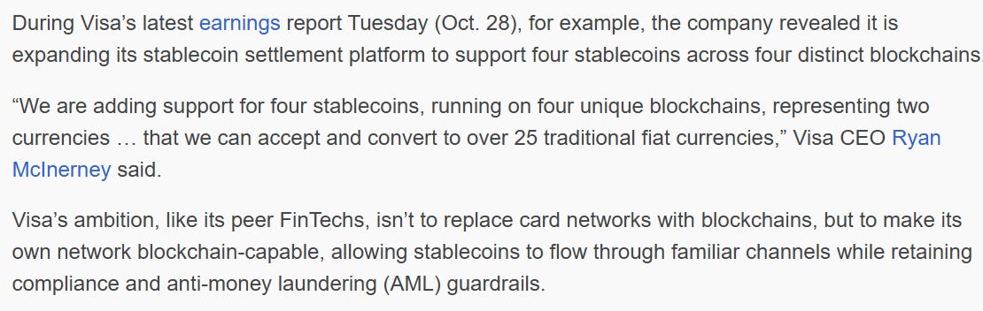 Visa’s publicly announced expansion of stablecoin settlement reflects this direction. As part of this effort, Aquanow partners with Visa to support stablecoin settlement capabilities, enabling financial institutions to settle transactions using approved stablecoins within Visa’s network. The focus is not on replacing existing rails, but on extending settlement options where tokenized money can improve efficiency, availability, or operational flexibility.